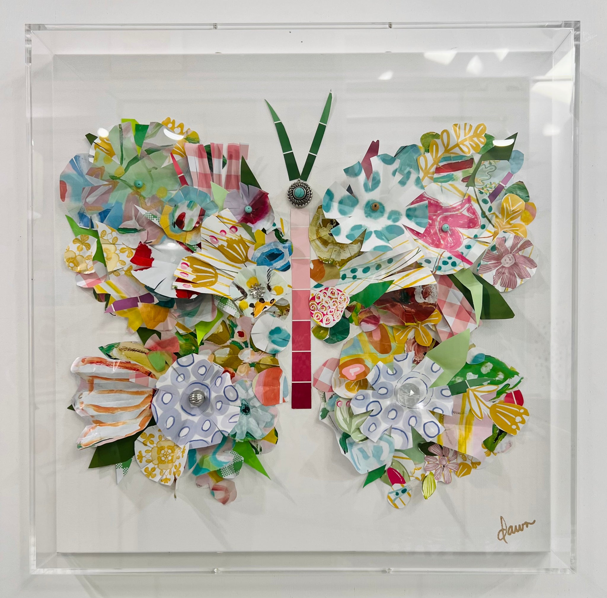 This is a one of a kind original piece from my Chrysalis collection, made from my exclusive painted papers and my digitally designed papers and vintage beads, mounted on a painted canvas in an acrylic box.