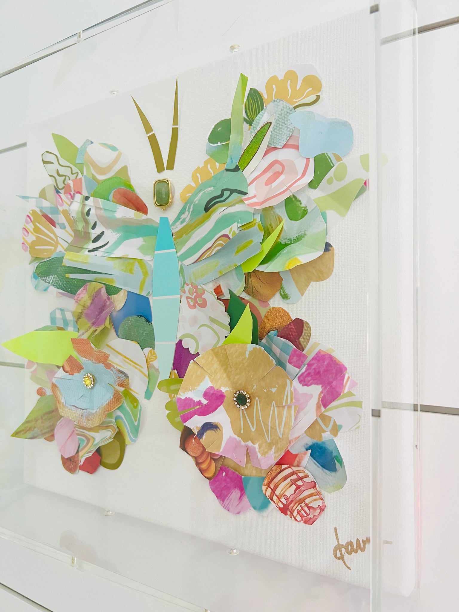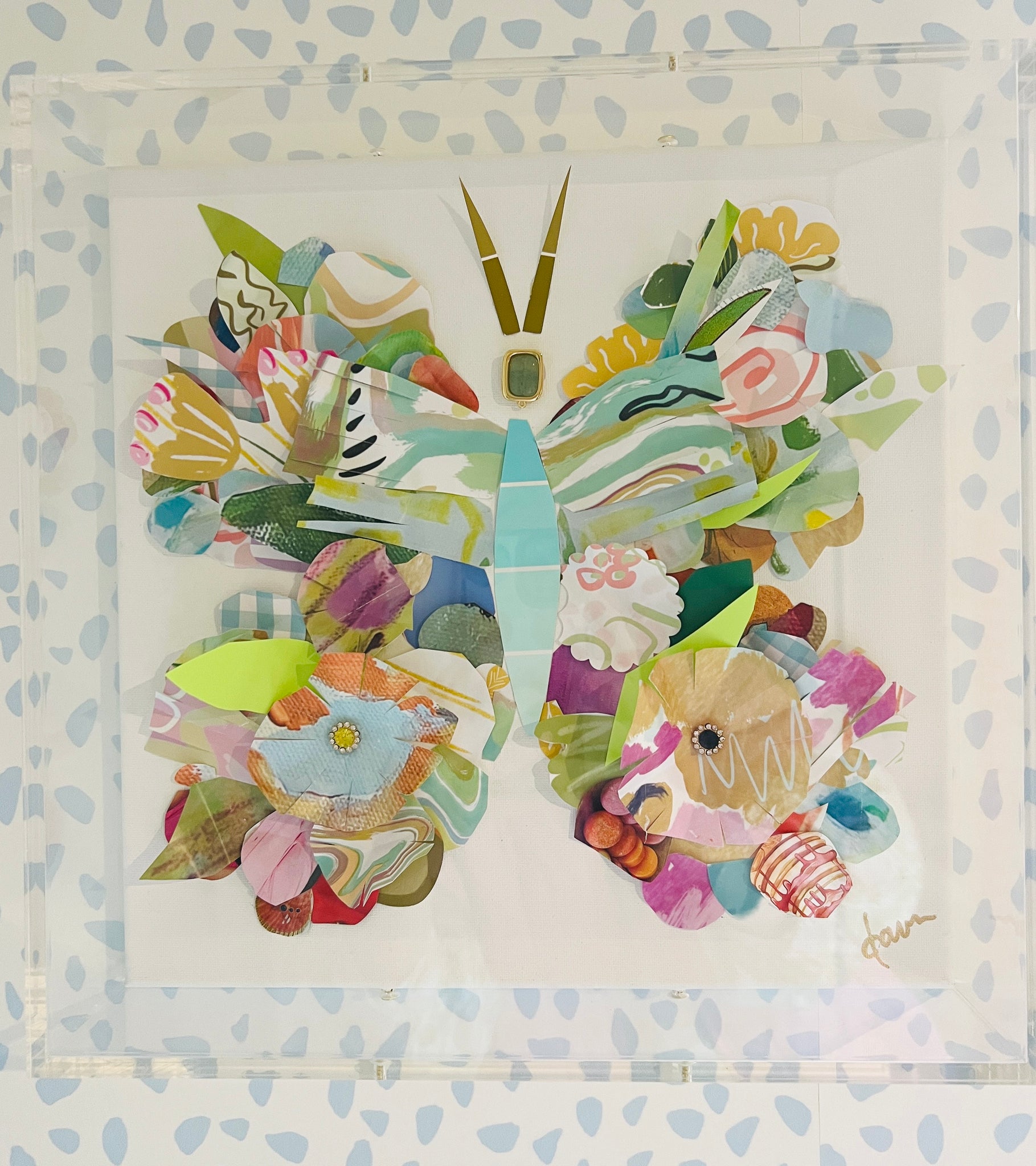 This is a one of a kind original piece from my New Beginnings collection, made from my exclusive painted papers and my digitally designed papers and vintage inspired jewels, mounted on canvas in an acrylic shadowbox.