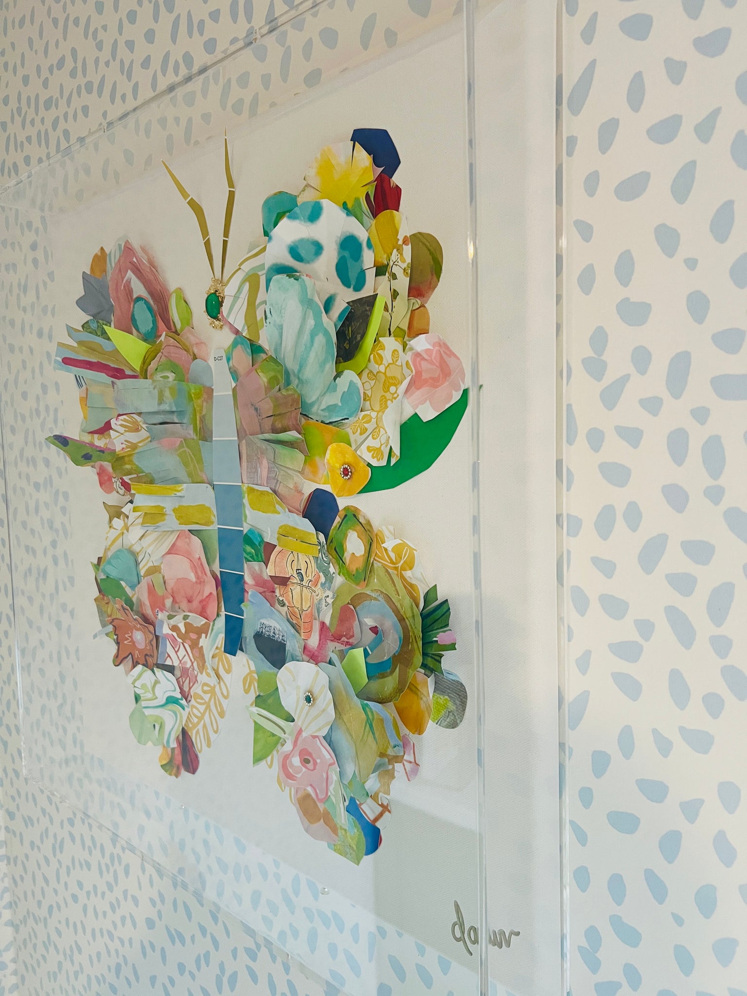This is a one of a kind original piece from my New Beginnings collection, made from my exclusive painted papers and my digitally designed papers and vintage inspired jewels, mounted on canvas in an acrylic shadowbox.