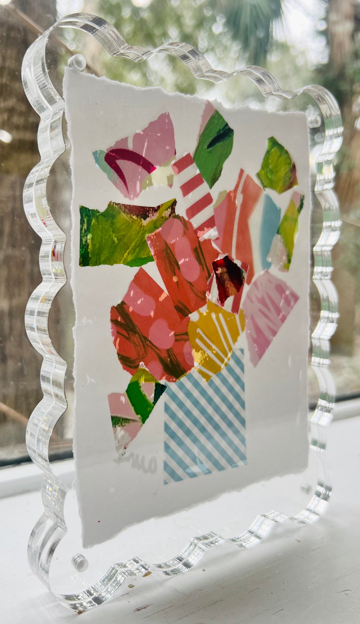 This is a one of a kind original piece from my New Beginnings collection, made from my exclusive painted papers in an acrylic scalloped frame.