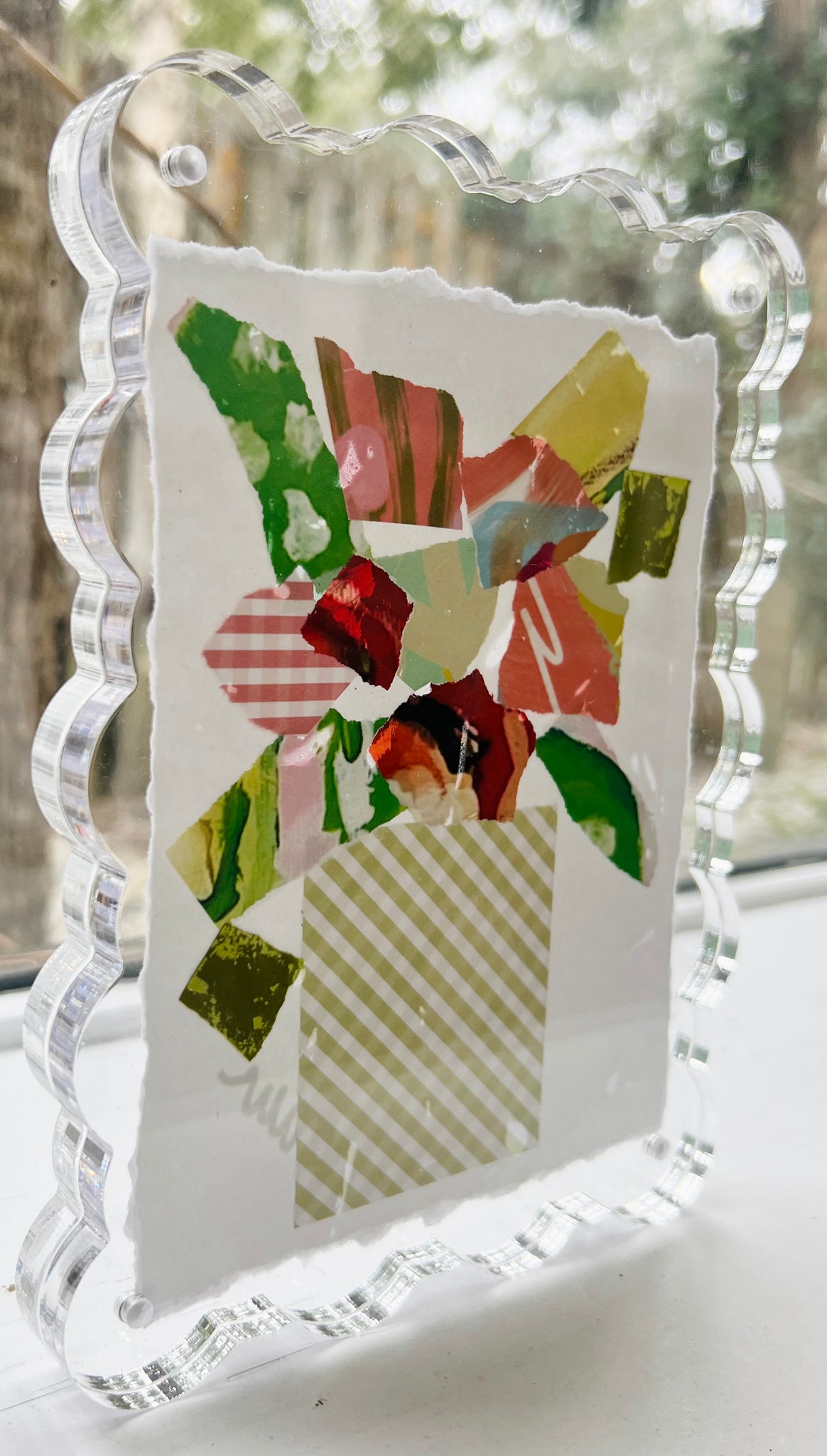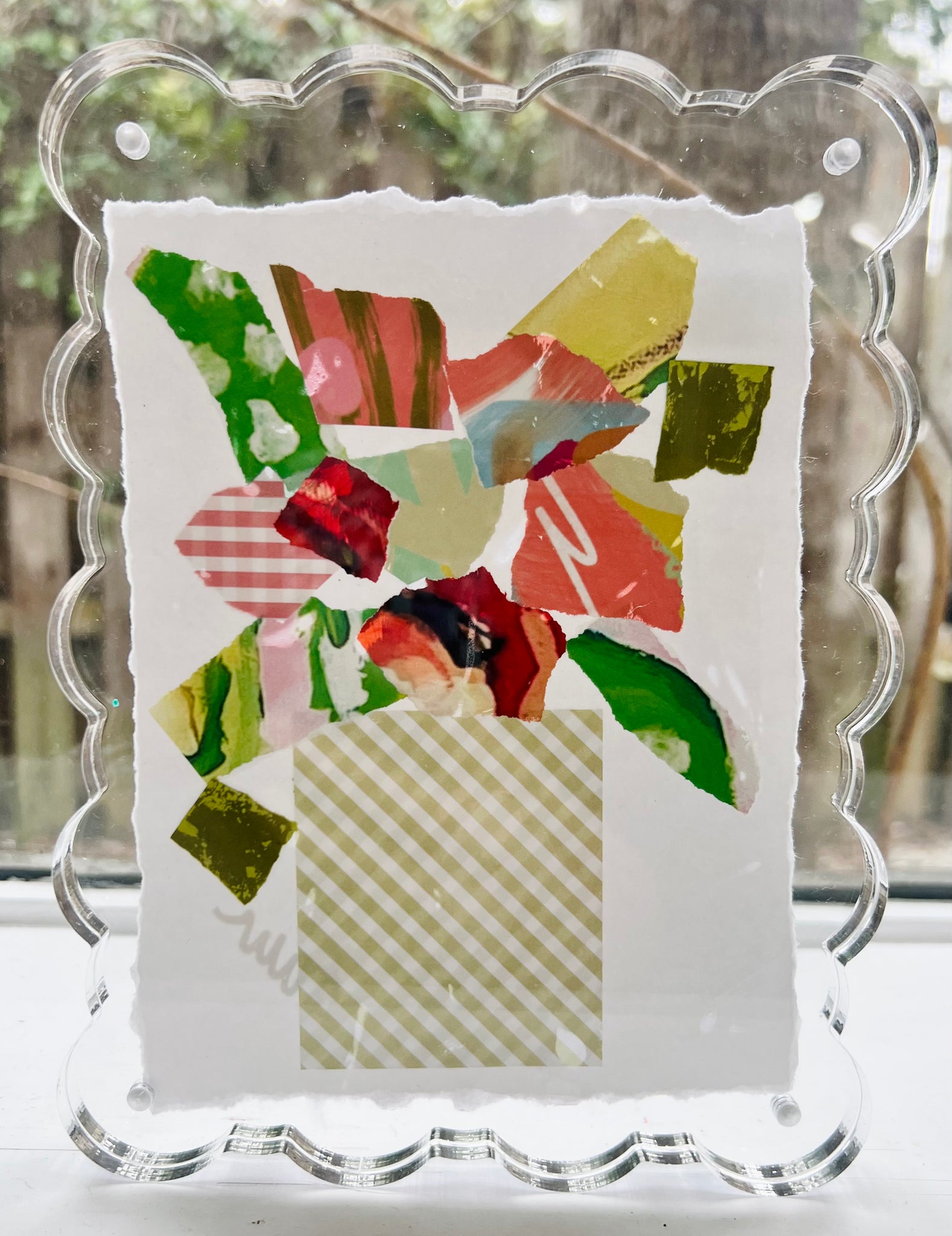 This is a one of a kind original piece from my New Beginnings collection, made from my exclusive painted papers in an acrylic scalloped frame.