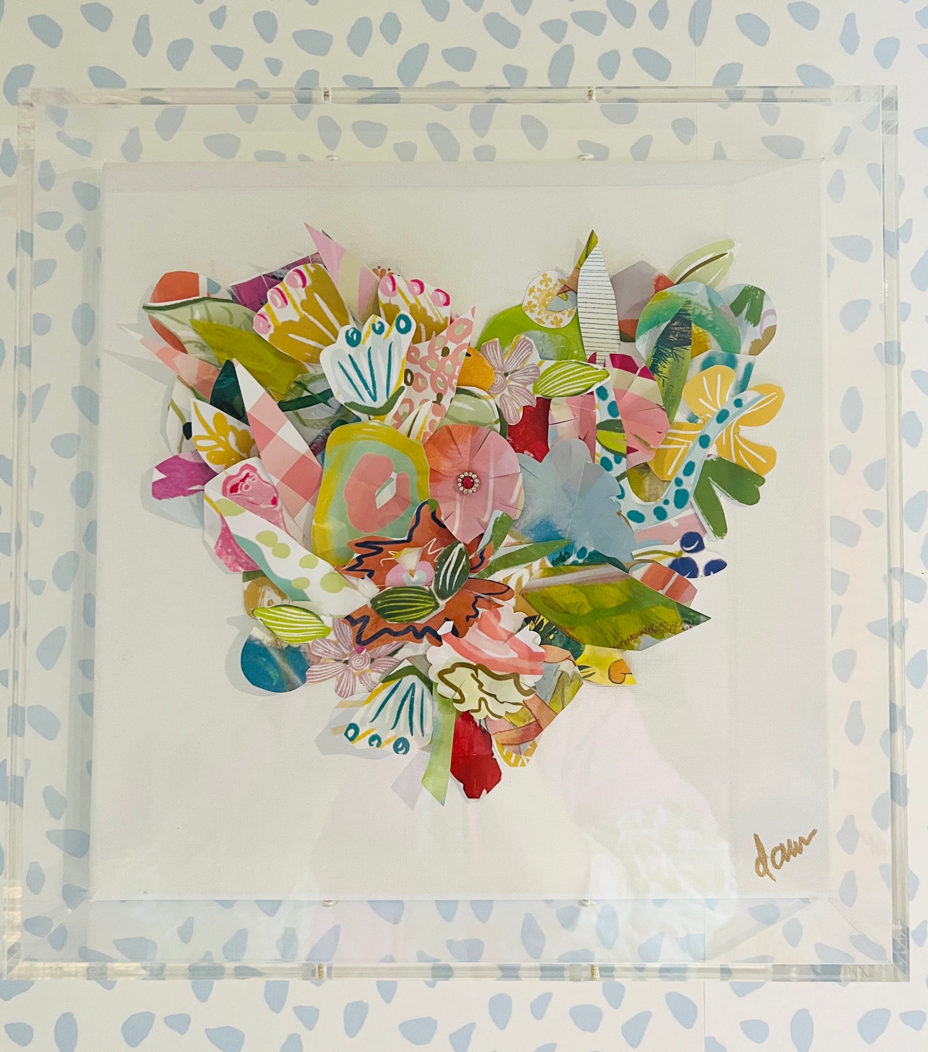 This is a one of a kind original piece from my New Beginnings collection, made from my exclusive painted papers and my digitally designed papers and vintage inspired jewels, mounted on canvas in an acrylic shadowbox.